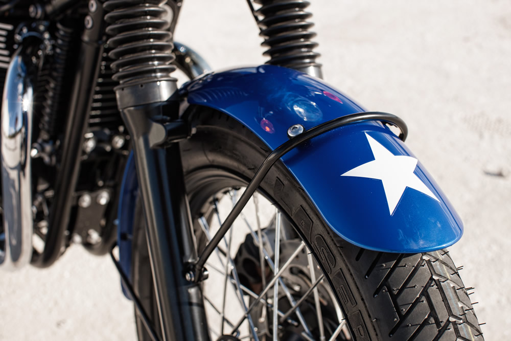 La nueva Bonneville T214 SE, recordando el diseño de Johnny Allen de 1956 “The Texas Cee-Car”, presenta un esquema de pintura de detalles a mano de color Caspian Blue y Pure White, complementada con exclusivos retoques en rojo y blanco, similares al de los años ’50. En el tapabarro delantero incorpora la estrella blanca distintiva en la ojiva de la streamliner de Allen. Además, destaca el color negro que se ha aplicado en el manillar y muelles traseros, así como las costuras en rojo de su asiento y faro delantero, que es esta edición es más pequeño.